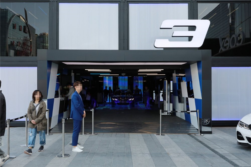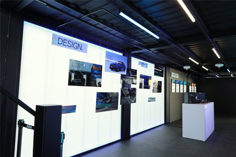 和許多極具科技感的展廳一樣,這座寶馬的展廳也是用了全黑的建筑背景,將室內的燈光效果和車身突顯出來。因此,會發現現場的燈都是以線條。