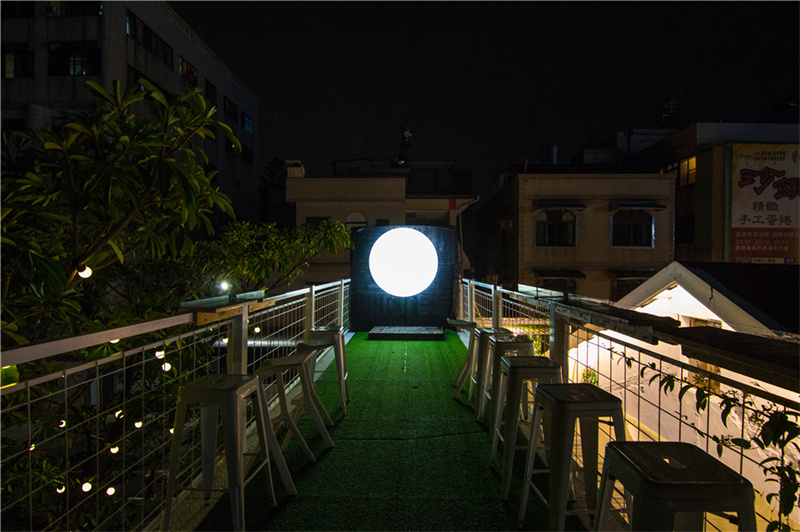 三樓是延伸長廊,由鐵欄桿圍起箱頂空間構成,同樣設置長桌和高腳椅,并在地面鋪設人造草坪,打造比室內更開闊和舒適環境,創造眺望的露臺。入夜之后,發光的“網紅月亮”將環境氛圍引向浪漫的高潮。