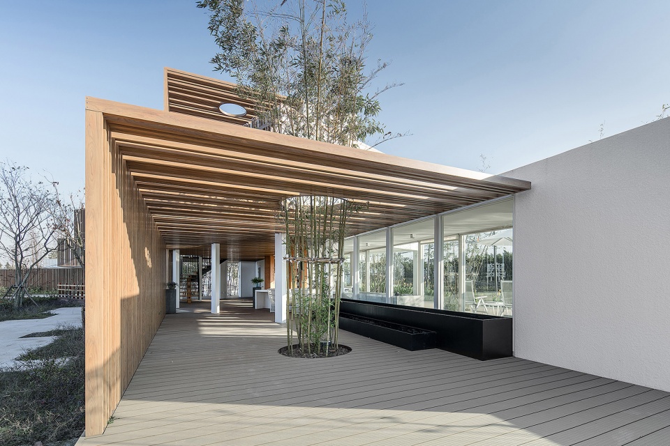 整個(gè)建筑群的顏色由白色和木色構(gòu)成,淺原木色搭配白色給人以干凈,簡(jiǎn)約,現(xiàn)代的視覺(jué)感;結(jié)合周邊大地的綠色襯托,使得整個(gè)建筑與自然分外協(xié)調(diào),相輔相成。蜿蜒的河流貫穿整個(gè)建筑的中央,使得建筑群更加充滿靈氣,仿佛潺潺的流水孕育著這些建筑群。